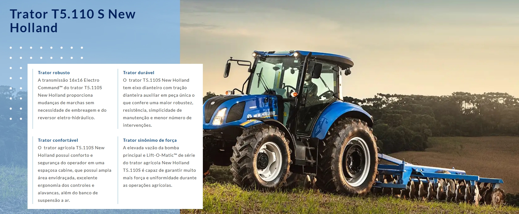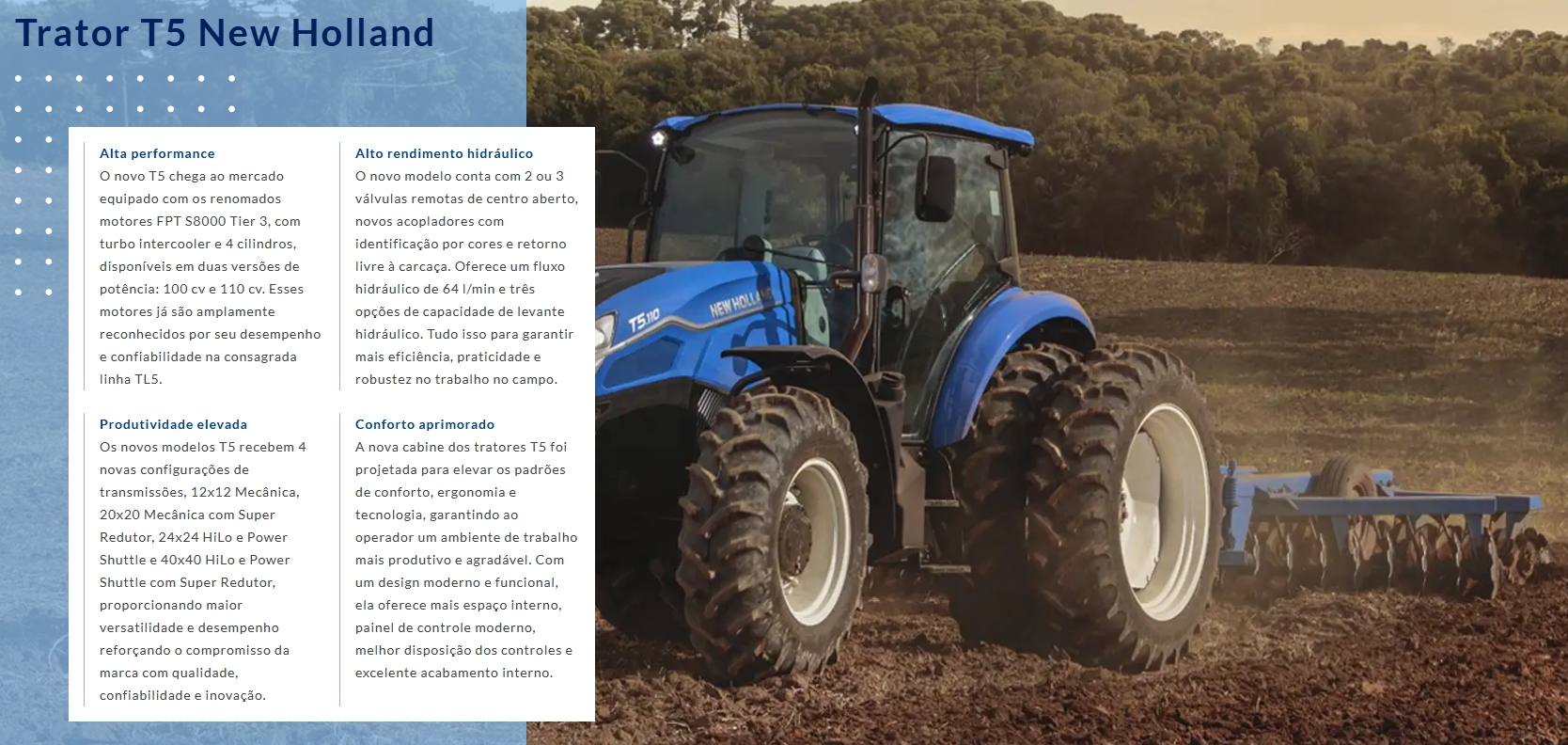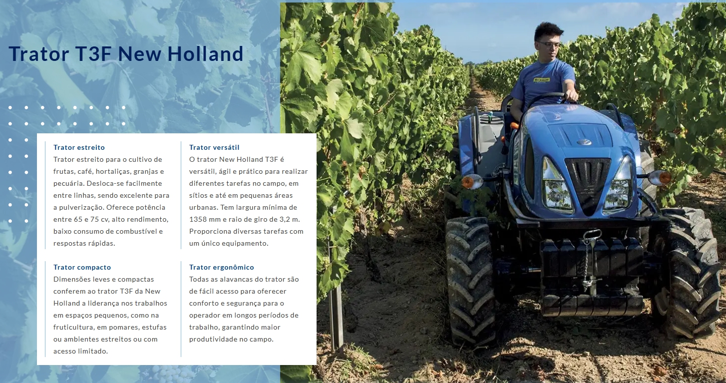 Sempre trilhando o caminho da inovação, os tratores da New Holland proporcionam facilidade na operação e o comprometimento da marca em oferecer o melhor para o seu campo.