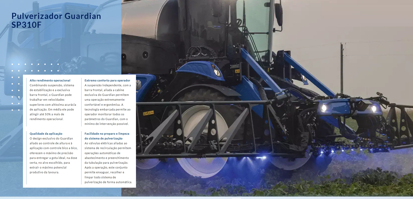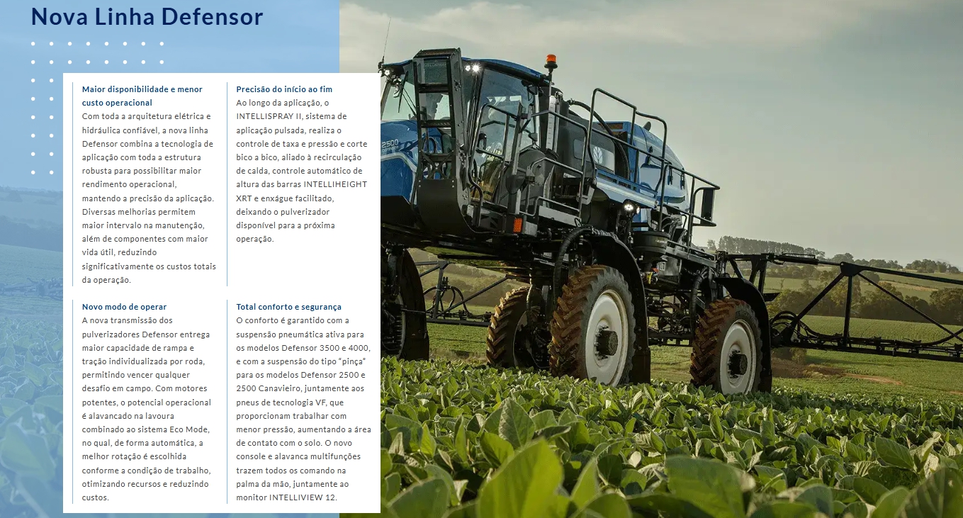 Os novos pulverizadores da linha Defensor possuem alta tecnologia para garantir a eficiência e rendimento em campo, além de proporcionar maior desempenho nas condições mais adversas da operação com o novo sistema de propulsão e tração individualizada por roda. Entregam máxima precisão do início ao fim e maior confiabilidade com a nova arquitetura eletrônica e hidráulica, além de apresentar total segurança e conforto para o operador, que trabalha em uma cabine pressurizada e com filtro de carvão ativado, com um console e monitor que disponibilizam todos os controles na palma da mão, de forma intuitiva.
