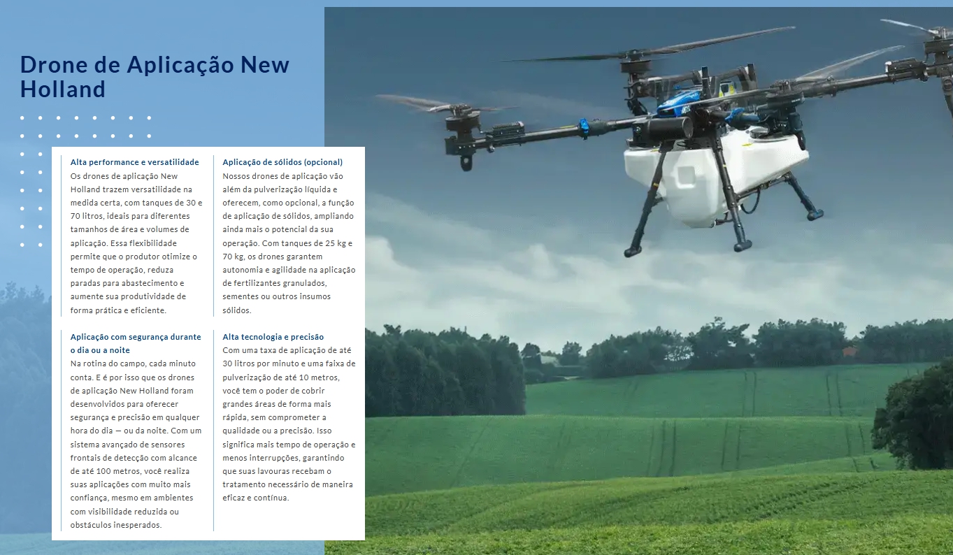O Drone de Aplicação New Holland foi projetado para transformar a forma como você gerencia sua produção. Com operação totalmente autônoma e tomada de decisão inteligente, ele garante manobras ágeis, aplicações precisas e um alto desempenho energético, tudo para otimizar os resultados no campo.