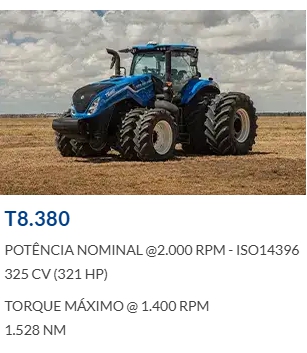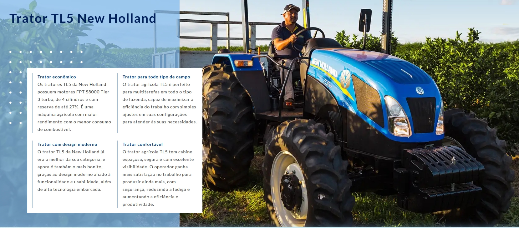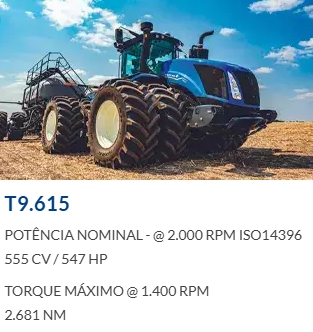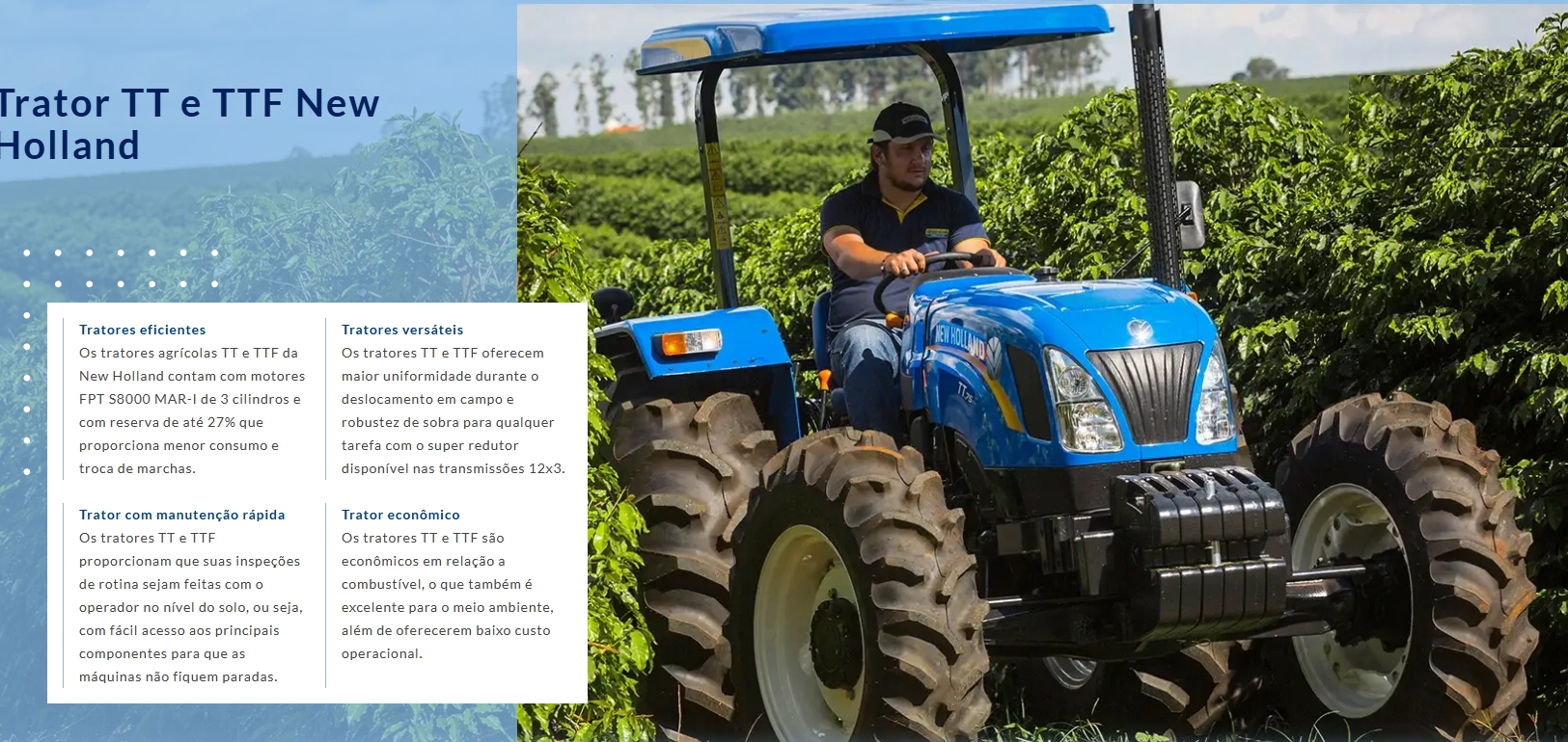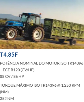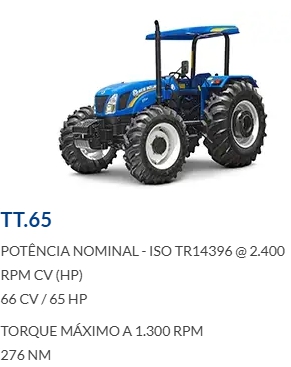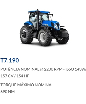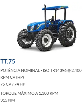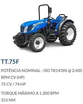 Ideais, principalmente, para o pequeno e o médio produtor pela sua força, agilidade e baixo consumo de combustível. Essas características fazem do trator New Holland uma máquina de excelente custo-benefício.