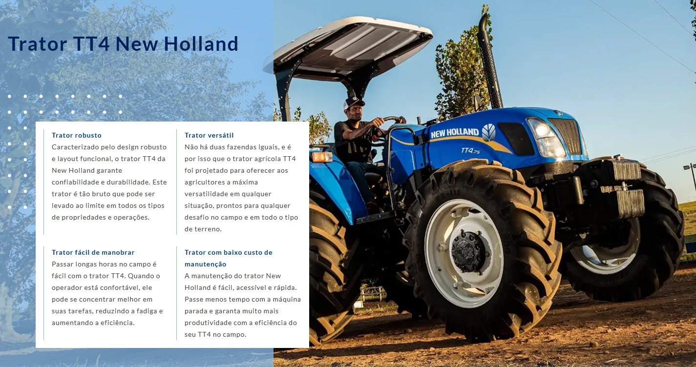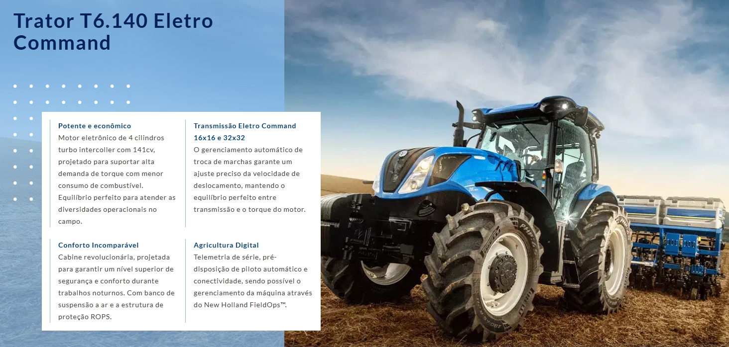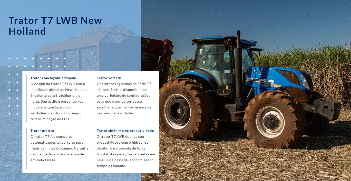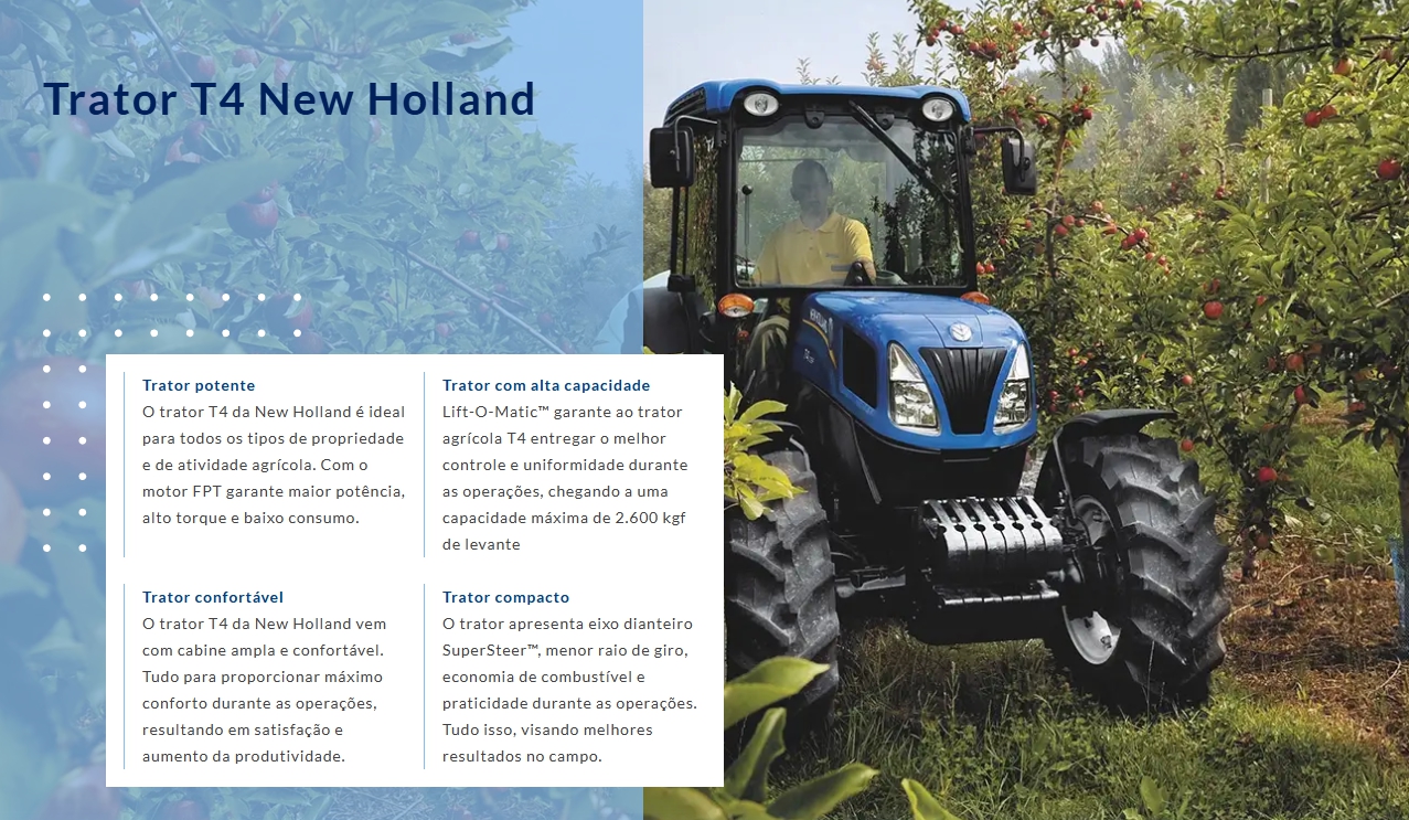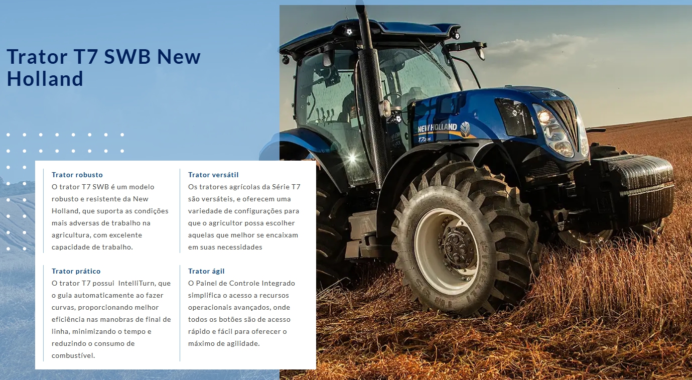 Sempre trilhando o caminho da inovação, os tratores da New Holland proporcionam facilidade na operação e o comprometimento da marca em oferecer o melhor para o seu campo.
