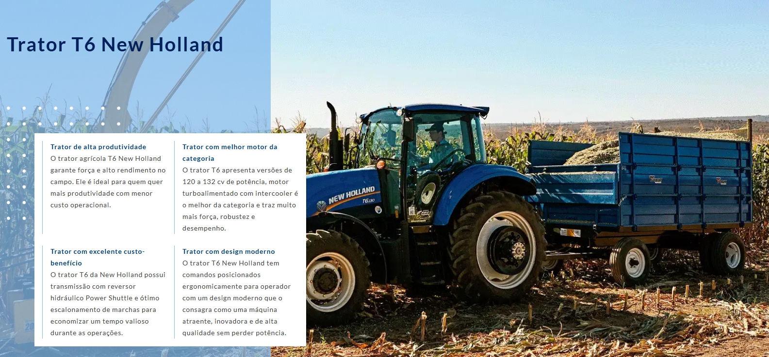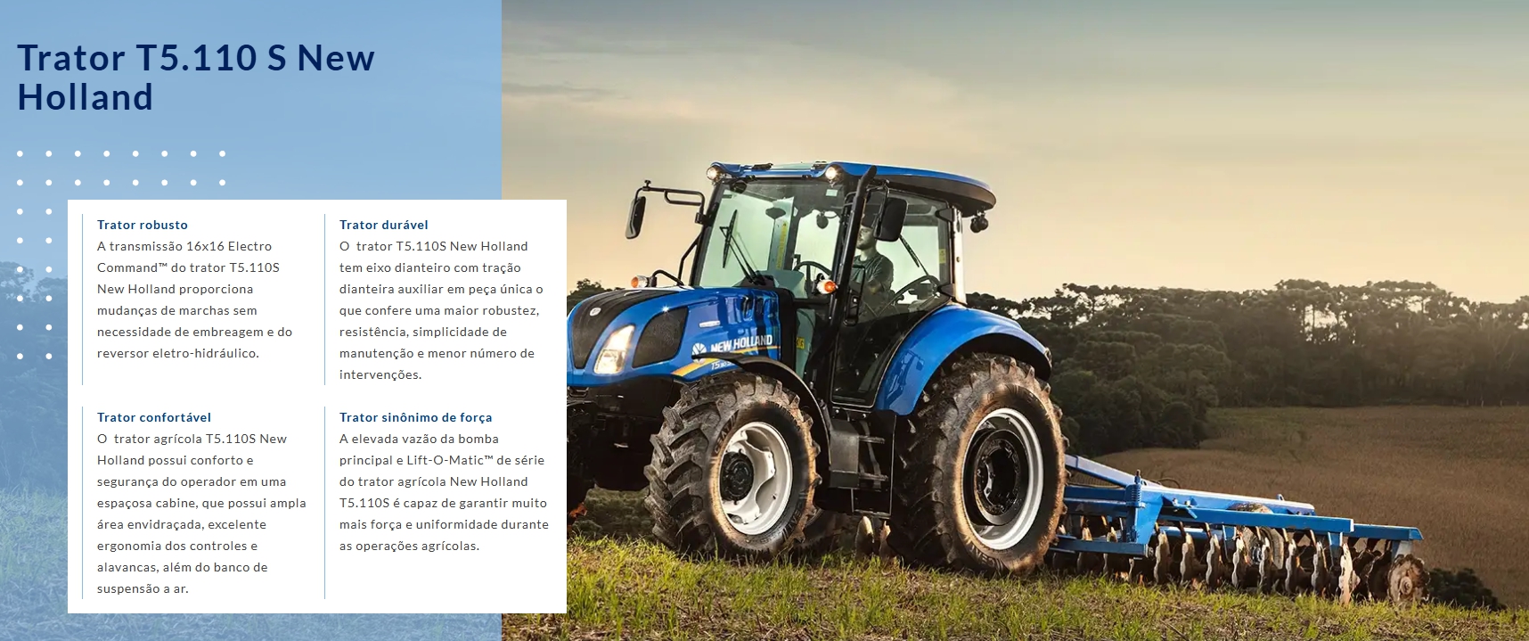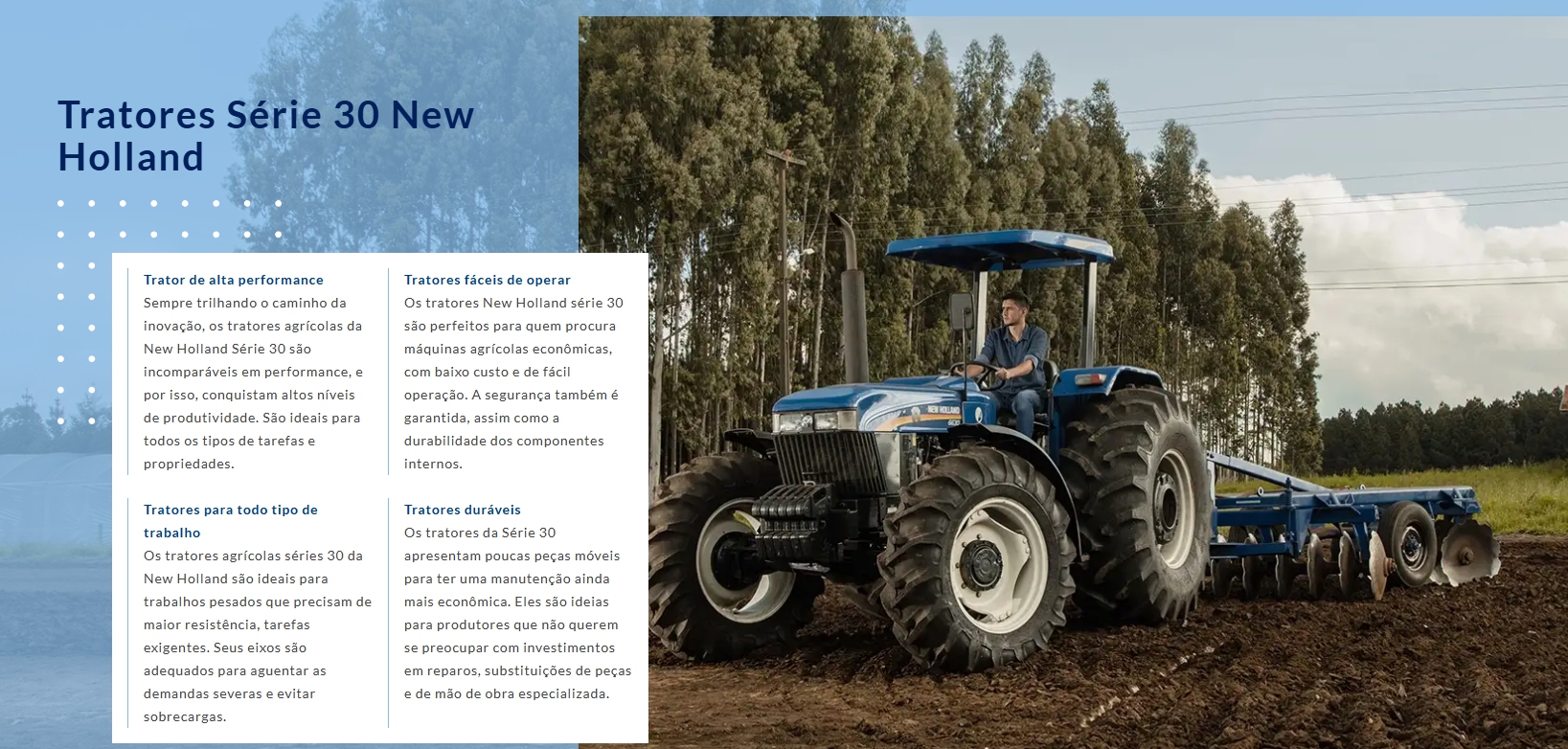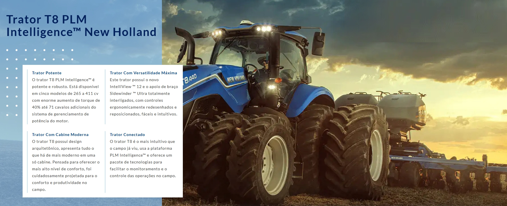 Sempre trilhando o caminho da inovação, os tratores da New Holland proporcionam facilidade na operação e o comprometimento da marca em oferecer o melhor para o seu campo.