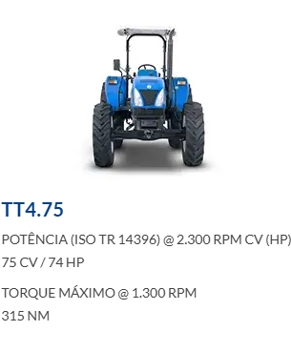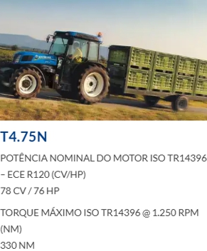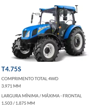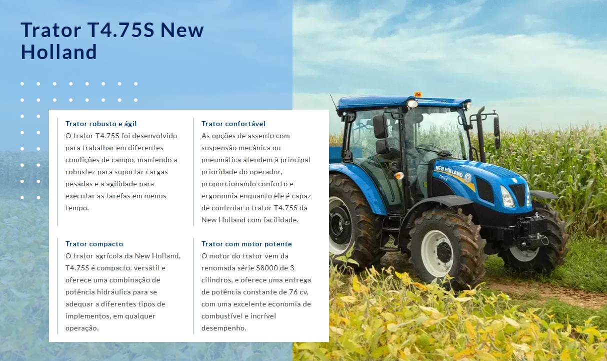 O trator T4.75S da New Holland oferece o equilíbrio perfeito entre eficiência, potência e consumo. Possui uma arquitetura similar aos já conhecidos modelos de tratores da linha TL5. Sua cabine é totalmente envidraçada, permitindo ao operador ter visibilidade operacional em 360° com total controle das operações.