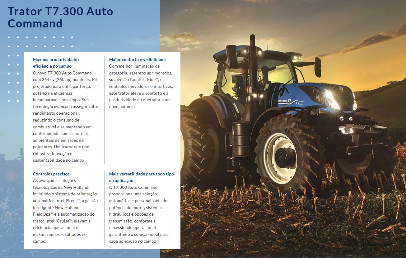 Além de sua alta produtividade, o T7.300 Auto Command destaca-se pelo baixo consumo de combustível, garantindo uma operação econômica sem comprometer o desempenho. Sua confiabilidade e simplicidade de operação tornam o T7.300 Auto Command a escolha ideal para profissionais que buscam eficiência e resultados consistentes.