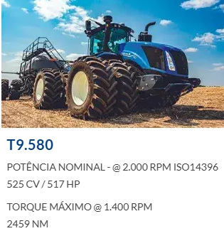 O motor FPT eletrônico de 06 cilindros e turbo com intercooler, conta com versões que vão até 144 cv a 182 cv nominais que quando considerando o EPM (gerenciamento de potência automático) pode receber até 27 cv a mais para suportar as demandas exigidas do campo.