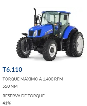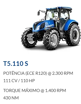 O trator New Holland T5.110S proporciona um funcionamento muito mais eficiente em todas as operações, graças ao seu motor econômico de 111cv de 4 cilindros, turbo-intercooler e alto torque, além de 145 litros de armazenamento de combustível, que contribui para menor tempo de máquina parada e maior rendimento operacional durante sua jornada de trabalho.
