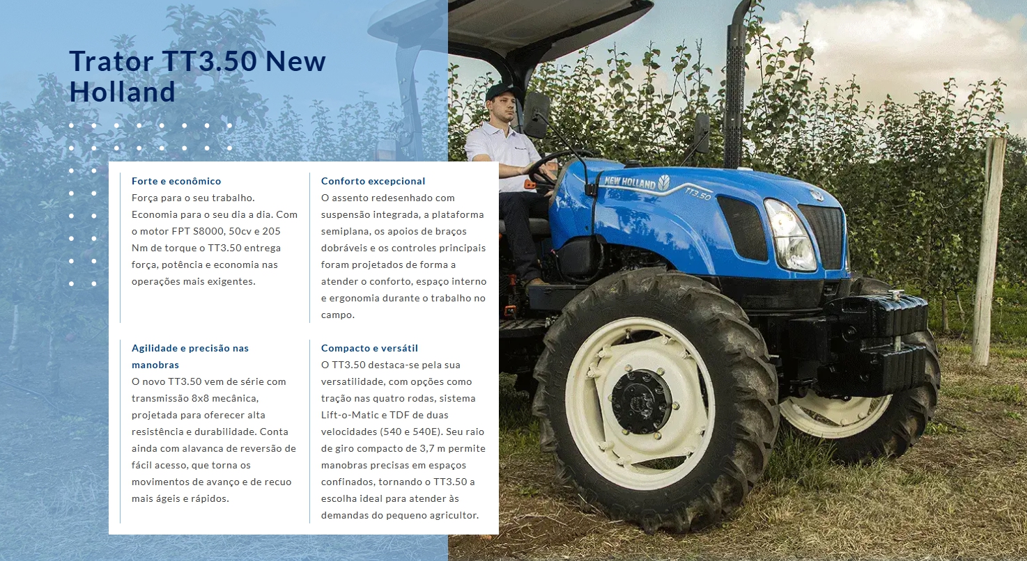 A New Holland está constantemente em busca de maneiras de expandir e aprimorar seu portfólio de tratores, visando sempre oferecer o que realmente os clientes brasileiros necessitam. Após uma extensa pesquisa, identificamos a demanda crescente por tratores utilitários no Brasil, contudo, ainda não tínhamos em nosso consagrado portfólio um trator que atendesse essa demanda promissora de tratores de até 50 cv, por isso estamos orgulhosos em anunciar o lançamento do novo TT3.50. Este trator foi projetado com o conceito de simplicidade, combinando um design inovador, e claro, sua robustez, resistência e potência incomparável.