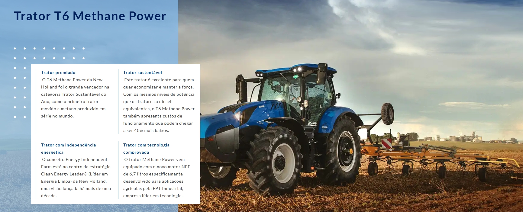 A New Holland tem o prazer de anunciar o lançamento da nova linha de tratores agrícolas T6 Methane Power, o primeiro e único trator de produção 100% movido a metano do mundo. Esse trator dá ao produtor rural a possibilidade de utilizar o biogás, que é um gás natural, gerado dentro da propriedade (a partir dos dejetos dos animais, por exemplo) para abastecer, aproveitando o ciclo virtuoso da fazenda, que se torna cada vez mais autossuficiente em energia e ambientalmente correta, bem como redução dos seus custos operacionais e autonomia na produção e uso de combustível, ficando livre de todas as incertezas do mercado de combustíveis fósseis como o petróleo.